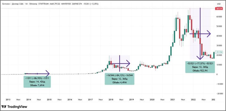 Наглядно на графике каждый криптозимний случай отмечен фиолетовыми стрелками, измеряющими амплитуду падения и его длительность.