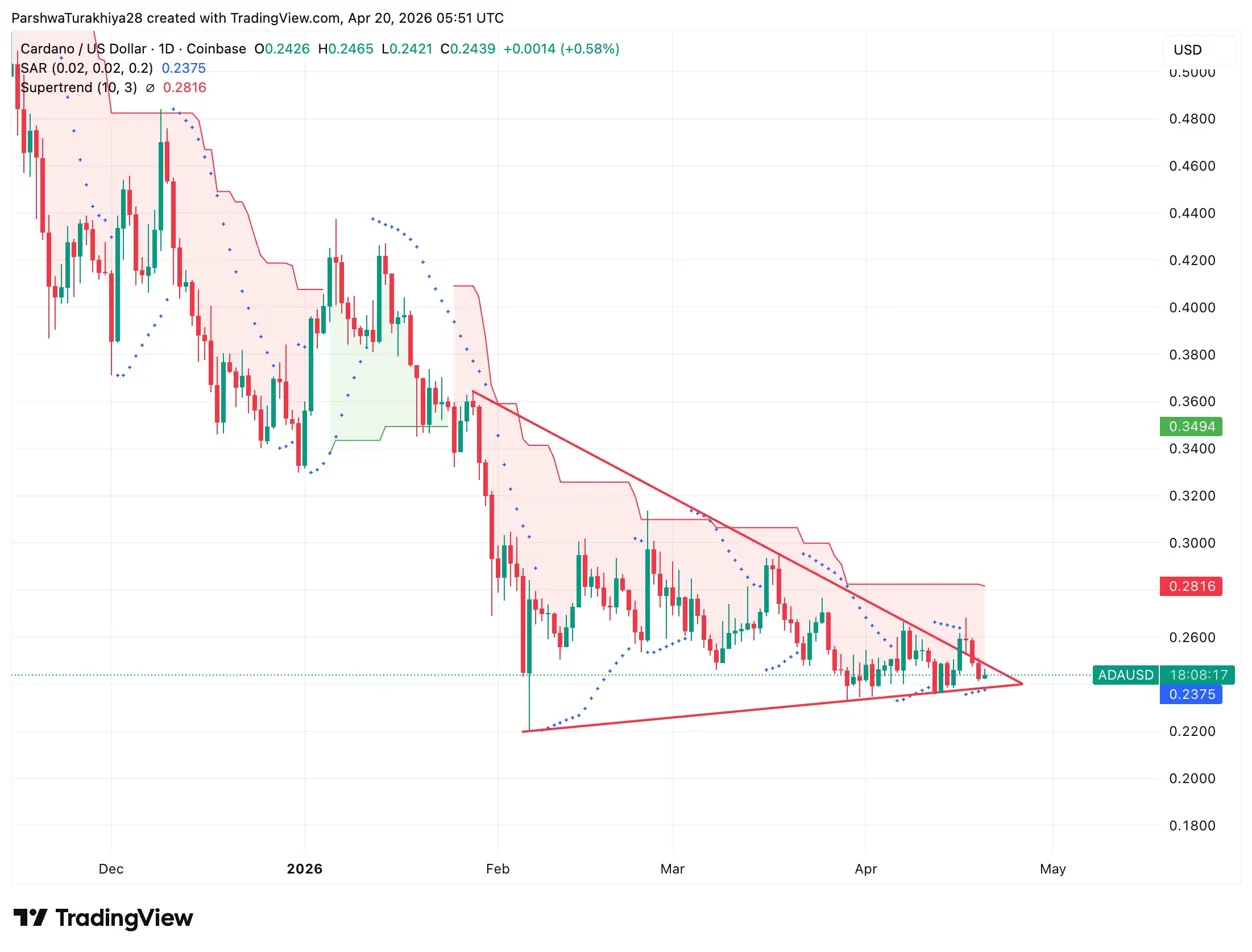$ADA торгуется на уровне $0,2439 20 апреля, что на 0,58% больше, удерживая клиновидное дно на SAR на уровне $0,2375 после того, как ВМС США захватили иранское грузовое судно Touska в Оманском заливе — прямая эскалация, которая снизила рынки в преддверии воскресенья и создала серьёзное давление на техническую структуру $ADA в начале недели.