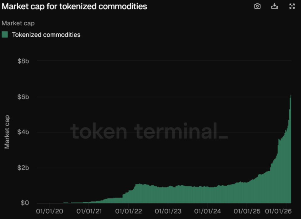 На начало 2026 года рынок токениизированных товаров оценивался в чуть более $4 млрд, показывает аналитика платформы Token Terminal. К концу первой декады февраля объем увеличился примерно на $2 млрд. Год к году рынок токенизированных товаров показал рост на 360%. При этом скорость роста с начала года заметно опережает рост других сегментов рынка токенизации: токенизированные акции выросли на 42%, а токенизированные паи фондов — лишь на 3,6%.